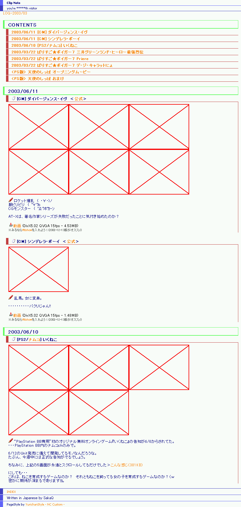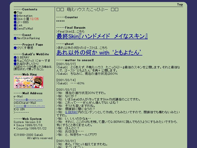 [2001/04/11] <『Q.BERAY』リニューアル> ![]() ・フレームをやめる。 ・横を600pxで統一して、コンパクト化。 ・この後、INDEX以外はこの形式のまま現在に至る。 [2001/04/31] <『萌えハウス たこっぴぶー』閉鎖> ・この頃、著作権問題でSkinを作っていたサイトが軒並み閉鎖していたから、危険を感じて閉鎖。 | |||
